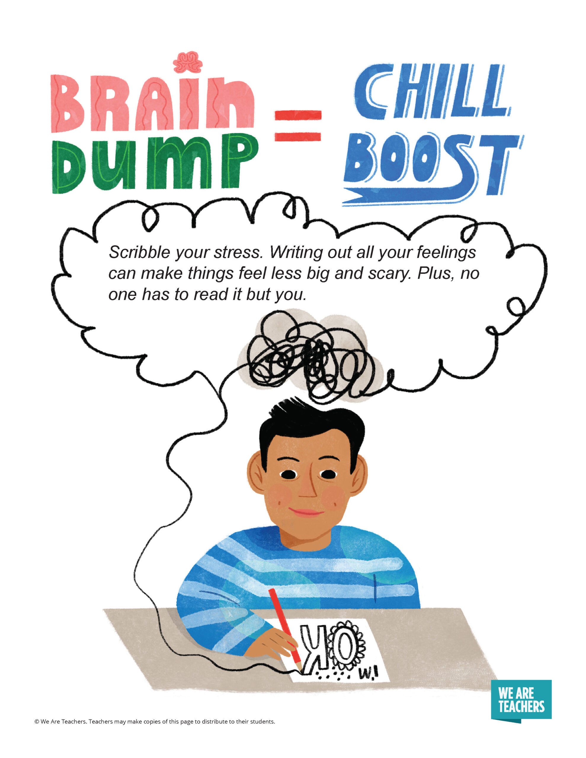 On page 4, students are encouraged to scribble or write out stress to make feelings “less big and scary.”