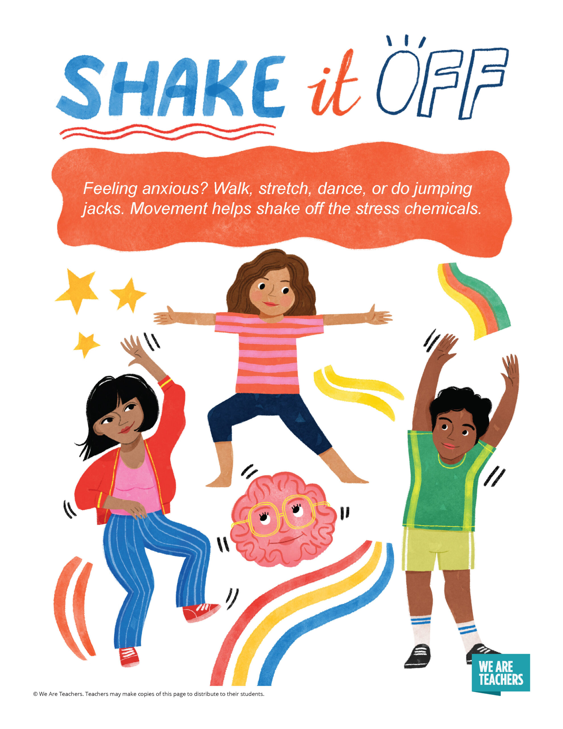 Page 3 reminds youth that movement can “shake off stress chemicals.”